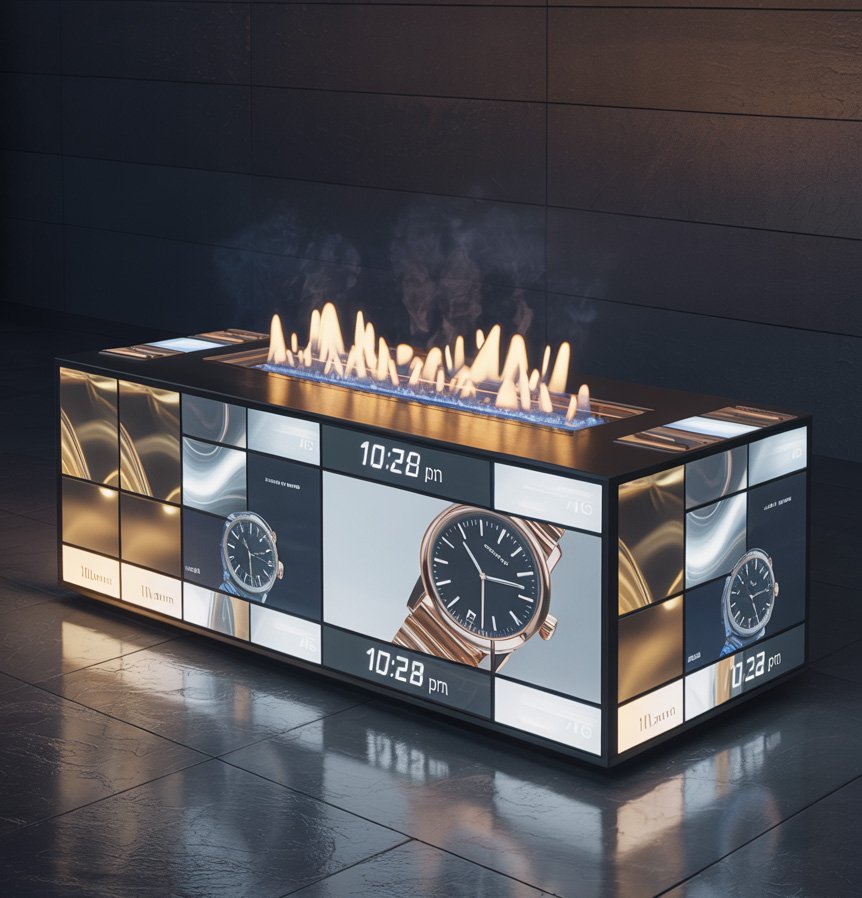 • Dynamic Content Display – Play ambient loops, patterns, or branded animations synced with live flame movement.