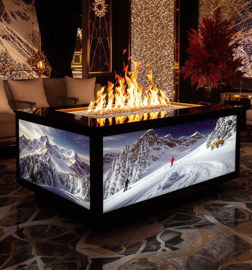 The LED Display Firepit redefines outdoor ambiance by combining real flame with immersive LED visuals. Surrounding the burner, high-resolution LED panels display motion graphics, ambient textures, or branded visuals that move in perfect harmony with the flames above. With advanced proportional flame control, users can adjust flame height in real time, creating captivating visual effects while also reducing gas consumption.