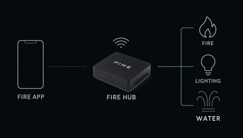 FIRE’s advanced control algorithms go far beyond simple on and off commands. Using proportional valve control and adaptive power balancing, flames can rise, pulse, and move dynamically while conserving fuel. Lights transition smoothly, audio stays perfectly in sync, and water features respond in harmony, all coordinated through the Hub’s real-time processing engine.